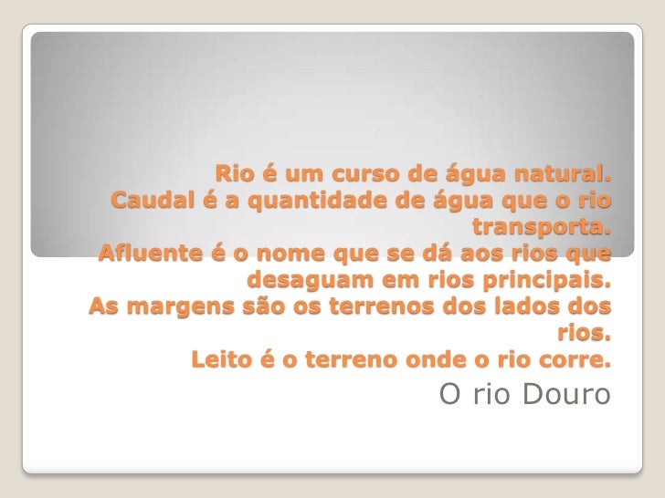 3. 3. Rio é um curso de água natural. Caudal é a quantidade de água que o rio transporta.Afluente é o nome que se dá aos rios que desaguam em rios principais.As margens são os terrenos dos lados dos rios.Leito é o terreno onde o rio corre.<br />O rio Douro<br />