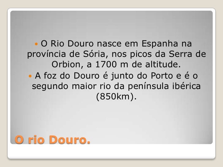5. 5. O rio Douro.<br />O Rio Douro nasce em Espanha na província de Sória, nos picos da Serra de Orbion, a 1700 m de altitude.<br />A foz do Douro é junto do Porto e é o segundo maior rio da península ibérica (850km).<br />