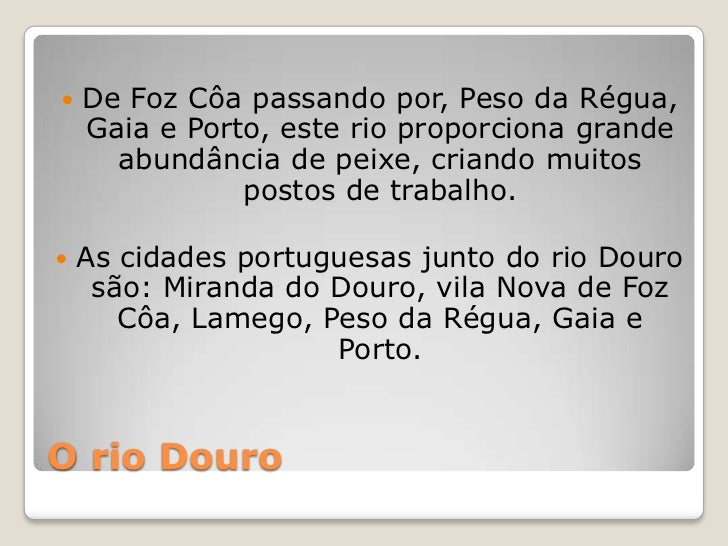 6. 6. O rio Douro<br />De Foz Côa passando por, Peso da Régua, Gaia e Porto, este rio proporciona grande abundância de peixe, criando muitos postos de trabalho.<br />As cidades portuguesas junto do rio Douro são: Miranda do Douro, vila Nova de Foz Côa, Lamego, Peso da Régua, Gaia e Porto. <br />