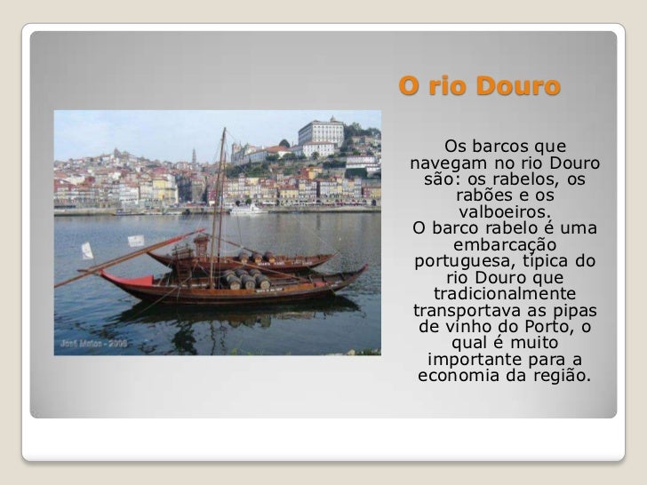 7. 7. O rio Douro<br />Os barcos que navegam no rio Douro são: os rabelos, os rabões e os valboeiros.<br />O barco rabelo é uma embarcação portuguesa, típica do rio Douro que tradicionalmente transportava as pipas de vinho do Porto, o qual é muito importante para a economia da região.<br />
