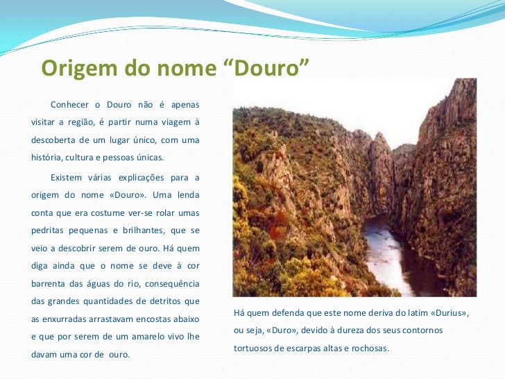 2. 2. Origem do nome “Douro”<br /> Conhecer o Douro não é apenas visitar a região, é partir numa viagem à descoberta de um lugar único, com uma história, cultura e pessoas únicas.<br /> Existem várias explicações para a origem do nome «Douro». Uma lenda conta que era costume ver-se rolar umas pedritas pequenas e brilhantes, que se veio a descobrir serem de ouro. Há quem diga ainda que o nome se deve à cor barrenta das águas do rio, consequência das grandes quantidades de detritos que as enxurradas arrastavam encostas abaixo e que por serem de um amarelo vivo lhe davam uma cor de ouro. <br />Há quem defenda que este nome deriva do latim «Durius», ou seja, «Duro», devido à dureza dos seus contornos tortuosos de escarpas altas e rochosas.<br />