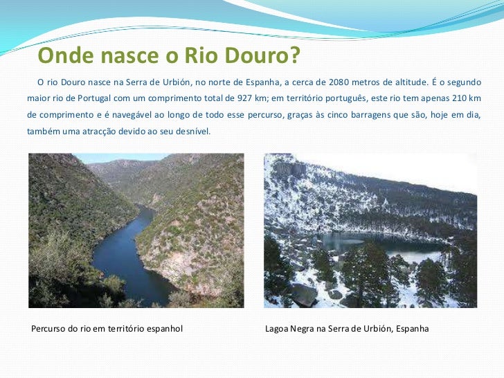 3. 3. Onde nasce o Rio Douro?<br /> O rio Douro nasce na Serra de Urbión, no norte de Espanha, a cerca de 2080 metros de altitude. É o segundo maior rio de Portugal com um comprimento total de 927 km; em território português, este rio tem apenas 210 km de comprimento e é navegável ao longo de todo esse percurso, graças às cinco barragens que são, hoje em dia, também uma atracção devido ao seu desnível. <br />Lagoa Negra na Serra de Urbión, Espanha<br />Percurso do rio em território espanhol<br />
