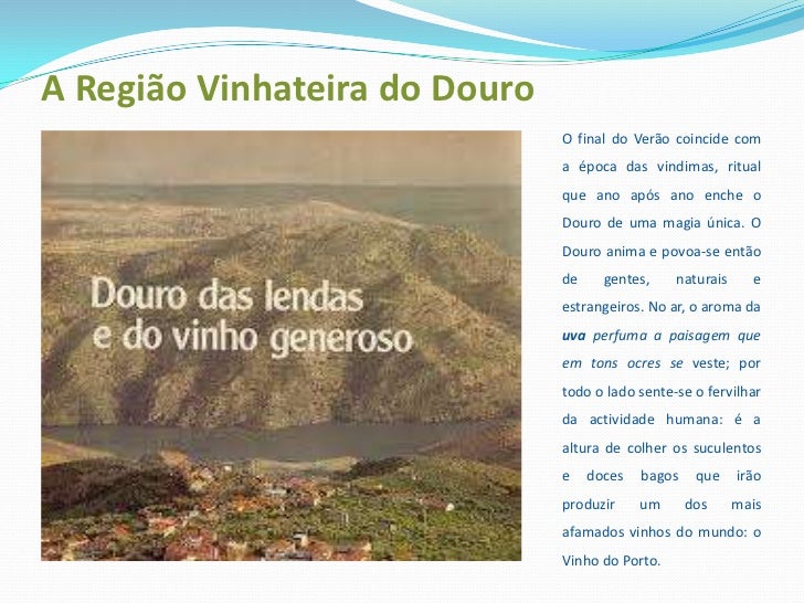 7. 7. A Região Vinhateira do Douro<br />O final do Verão coincide com a época das vindimas, ritual que ano após ano enche o Douro de uma magia única. O Douro anima e povoa-se então de gentes, naturais e estrangeiros. No ar, o aroma da uva perfuma a paisagem que em tons ocres se veste; por todo o lado sente-se o fervilhar da actividade humana: é a altura de colher os suculentos e doces bagos que irão produzir um dos mais afamados vinhos do mundo: o Vinho do Porto.<br />
