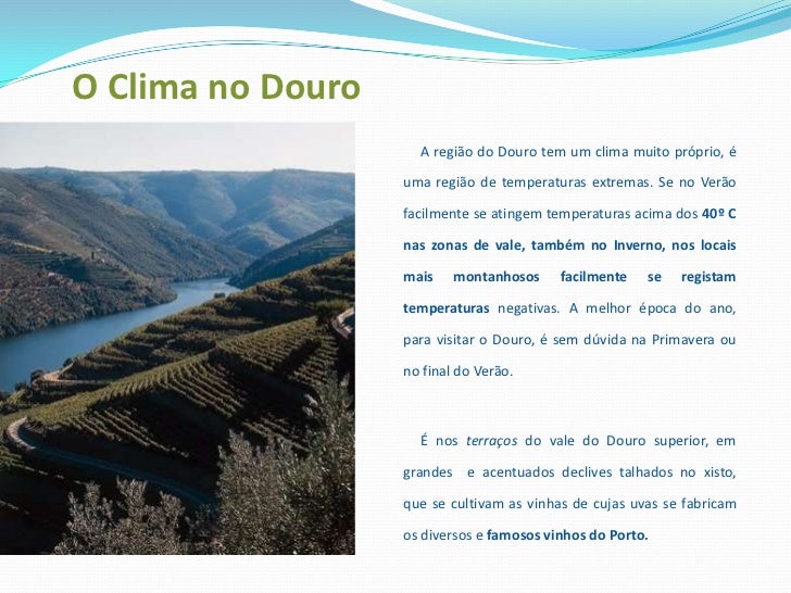 8. 8. O Clima no Douro<br /> A região do Douro tem um clima muito próprio, é uma região de temperaturas extremas. Se no Verão facilmente se atingem temperaturas acima dos 40º C nas zonas de vale, também no Inverno, nos locais mais montanhosos facilmente se registam temperaturas negativas. A melhor época do ano, para visitar o Douro, é sem dúvida na Primavera ou no final do Verão. <br /> É nos terraços do vale do Douro superior, em grandes e acentuados declives talhados no xisto, que se cultivam as vinhas de cujas uvas se fabricam os diversos e famosos vinhos do Porto.<br />