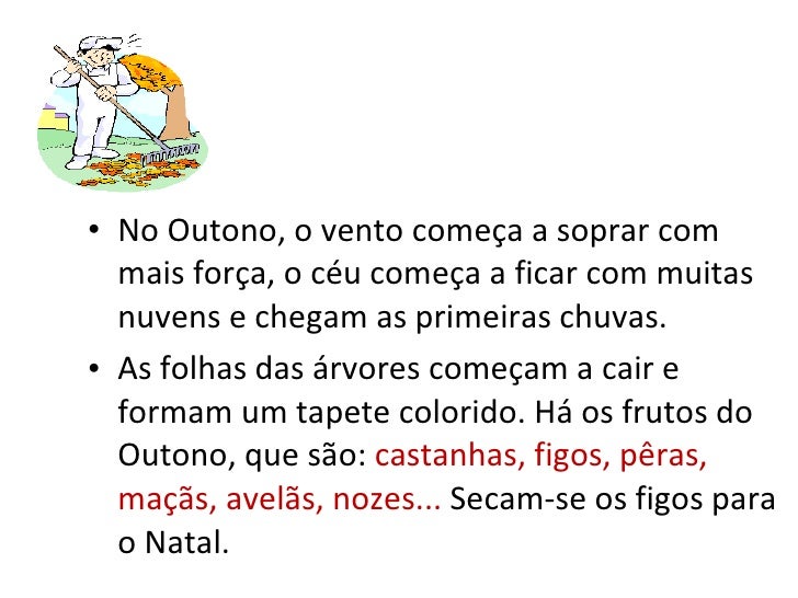 1. 2. <ul><li>No Outono, o vento começa a soprar com mais força, o céu começa a ficar com muitas nuvens e chegam as primeiras chuvas. </li></ul><ul><li>As folhas das árvores começam a cair e formam um tapete colorido. Há os frutos do Outono, que são: castanhas, figos, pêras, maçãs, avelãs, nozes... Secam-se os figos para o Natal. </li></ul>