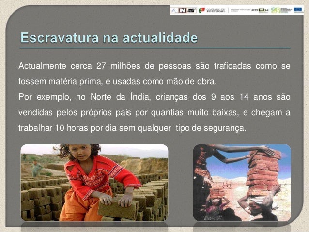 10. 10. Actualmente cerca 27 milhões de pessoas são traficadas como sefossem matéria prima, e usadas como mão de obra.Por exemplo, no Norte da Índia, crianças dos 9 aos 14 anos sãovendidas pelos próprios pais por quantias muito baixas, e chegam atrabalhar 10 horas por dia sem qualquer tipo de segurança.