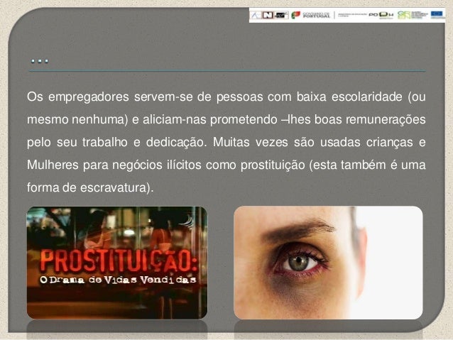 11. 11. Os empregadores servem-se de pessoas com baixa escolaridade (oumesmo nenhuma) e aliciam-nas prometendo –lhes boas remuneraçõespelo seu trabalho e dedicação. Muitas vezes são usadas crianças eMulheres para negócios ilícitos como prostituição (esta também é umaforma de escravatura).