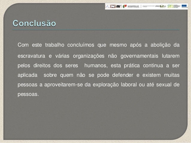 12. 12. Com este trabalho concluímos que mesmo após a abolição daescravatura e várias organizações não governamentais lutarempelos direitos dos seres humanos, esta prática continua a seraplicada sobre quem não se pode defender e existem muitaspessoas a aproveitarem-se da exploração laboral ou até sexual depessoas.