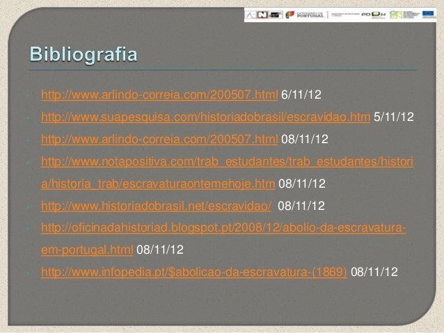 14. 14. • http://www.arlindo-correia.com/200507.html 6/11/12• http://www.suapesquisa.com/historiadobrasil/escravidao.htm 5/11/12• http://www.arlindo-correia.com/200507.html 08/11/12• http://www.notapositiva.com/trab_estudantes/trab_estudantes/historia/historia_trab/escravaturaontemehoje.htm 08/11/12• http://www.historiadobrasil.net/escravidao/ 08/11/12• http://oficinadahistoriad.blogspot.pt/2008/12/abolio-da-escravatura-em-portugal.html 08/11/12• http://www.infopedia.pt/$abolicao-da-escravatura-(1869) 08/11/12