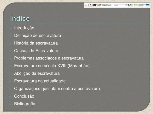 2. 2.  Introdução Definição de escravatura História da escravatura Causas da Escravatura Problemas associados à escravatura Escravatura no século XVIII (Maranhão) Abolição da escravatura Escravatura na actualidade Organizações que lutam contra a escravatura Conclusão Bibliografia