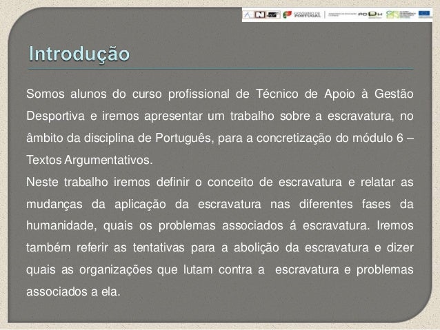 3. 3. Somos alunos do curso profissional de Técnico de Apoio à GestãoDesportiva e iremos apresentar um trabalho sobre a escravatura, noâmbito da disciplina de Português, para a concretização do módulo 6 –Textos Argumentativos.Neste trabalho iremos definir o conceito de escravatura e relatar asmudanças da aplicação da escravatura nas diferentes fases dahumanidade, quais os problemas associados á escravatura. Iremostambém referir as tentativas para a abolição da escravatura e dizerquais as organizações que lutam contra a escravatura e problemasassociados a ela.