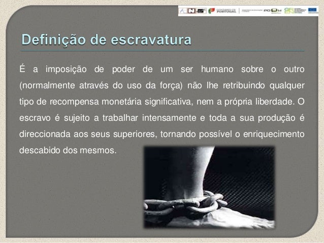 4. 4. É a imposição de poder de um ser humano sobre o outro(normalmente através do uso da força) não lhe retribuindo qualquertipo de recompensa monetária significativa, nem a própria liberdade. Oescravo é sujeito a trabalhar intensamente e toda a sua produção édireccionada aos seus superiores, tornando possível o enriquecimentodescabido dos mesmos.