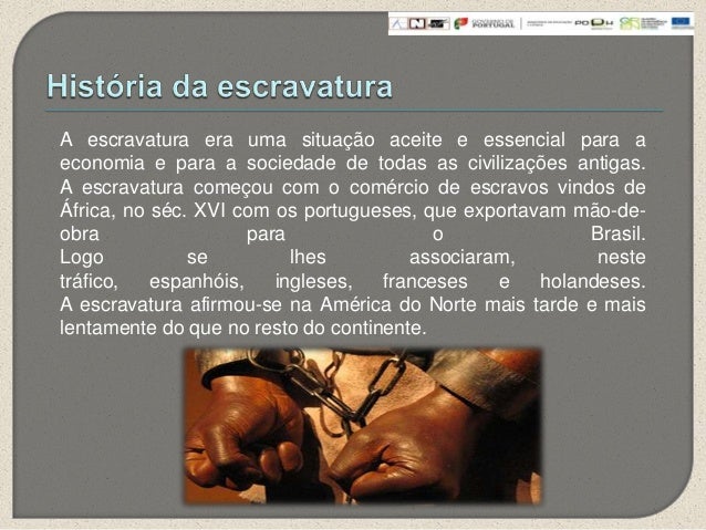 5. 5. A escravatura era uma situação aceite e essencial para aeconomia e para a sociedade de todas as civilizações antigas.A escravatura começou com o comércio de escravos vindos deÁfrica, no séc. XVI com os portugueses, que exportavam mão-de-obra para o Brasil.Logo se lhes associaram, nestetráfico, espanhóis, ingleses, franceses e holandeses.A escravatura afirmou-se na América do Norte mais tarde e maislentamente do que no resto do continente.