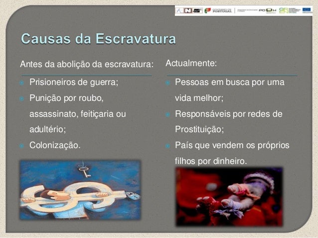6. 6. Antes da abolição da escravatura: Actualmente: Prisioneiros de guerra; Punição por roubo,assassinato, feitiçaria ouadultério; Colonização. Pessoas em busca por umavida melhor; Responsáveis por redes deProstituição; País que vendem os própriosfilhos por dinheiro.