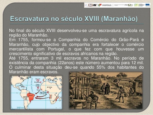 8. 8. No final do século XVIII desenvolveu-se uma escravatura agrícola naregião do Maranhão.Em 1755, formou-se a Companhia do Comércio do Grão-Pará eMaranhão, cujo objectivo da companhia era fortalecer o comérciomercantilista com Portugal, o que fez com que houvesse umcrescimento significativo de escravos africanos na região.Até 1755, entraram 3 mil escravos no Maranhão. No período deexistência da companhia (22anos) este número aumentou para 12 mil.O culminar desta situação deu-se quando 55% dos habitantes doMaranhão eram escravos.