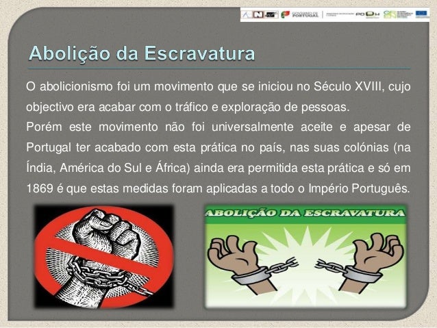 9. 9. O abolicionismo foi um movimento que se iniciou no Século XVIII, cujoobjectivo era acabar com o tráfico e exploração de pessoas.Porém este movimento não foi universalmente aceite e apesar dePortugal ter acabado com esta prática no país, nas suas colónias (naÍndia, América do Sul e África) ainda era permitida esta prática e só em1869 é que estas medidas foram aplicadas a todo o Império Português.