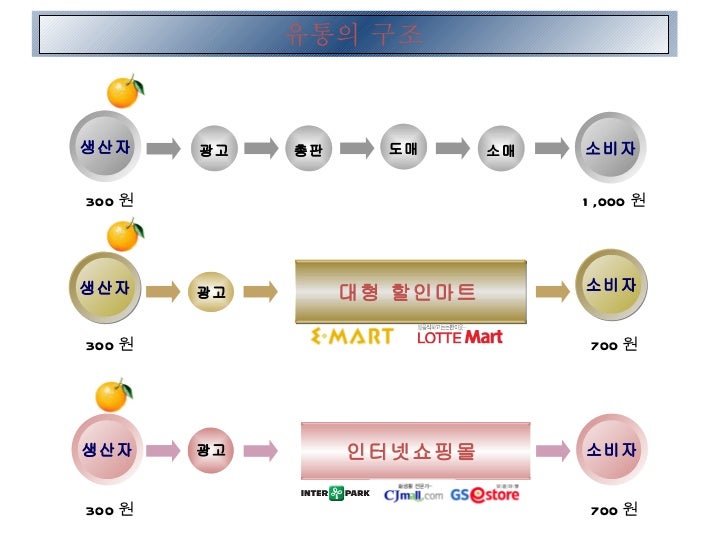 6. 13. 300 원 유통의 구조 생산자 총판 광고 도매 소매 소비자 1,000 원 광고 생산자 소비자 대형 할인마트 300 원 700 원 광고 생산자 인터넷쇼핑몰 소비자 300 원 700 원