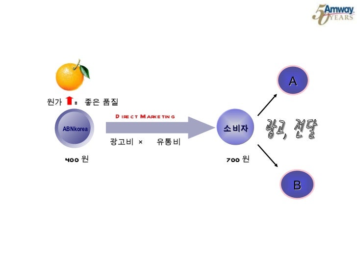 7. 14. ABNkorea 400 원 원가 = 좋은 품질 A B 광고비 × 유통비 Direct Marketing 700 원 소비자