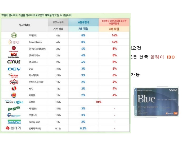 9. 25. W& 블루 멤버십 카드 ⇒ 암웨이 멤버십 카드가 W& 블루카드 로 … ◎ 특징 1. 암웨이 IBO 신분카드 2. OK 캐쉬백 제휴카드 4. SK 엔크린 보너스 카드 3. 스페셜 OK 캐쉬백 카드 – 최고 10 배 추가적립 가능 5. W& 프리미엄 혜택 - 모든 한국 암웨이 IBO ◎ 자격요건