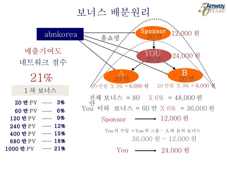10. 27. 1 차 보너스 You 보너스 배분원리 전체 보너스 = 80 만 You 이하 보너스 Sponsor 20 만원 X 3% = You 의 수입 = YOU Sponsor A B 매출기여도 21% 네트워크 점수 = 60 만 X 6% = 36,000 원 X 6% = 48,000 원 12,000 원 20 만원 X 3% = 6,000 원 36,000 원 - 12,000 원 6,000 원 You 의 그룹 – A 와 B 의 보너스 24,000 원 홈쇼핑 abnkorea 20 만 20 만 20 만 20 만 20 만 PV 3% 60 만 PV 6% 120 만 PV 9% 240 만 PV 12% 400 만 PV 15% 680 만 PV 18% 1000 만 PV 21% 12,000 원 24,000 원