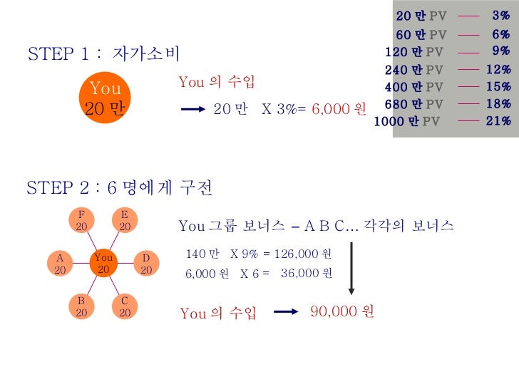 11. 28. You 20 만 STEP 1 : 자가소비 You 의 수입 STEP 2 : 6 명에게 구전 You 20 C 20 A 20 F 20 B 20 E 20 D 20 20 만 PV 3% 60 만 PV 6% 120 만 PV 9% 240 만 PV 12% 400 만 PV 15% 680 만 PV 18% 1000 만 PV 21% 20 만 X 3%= 6,000 원 140 만 X 9% You 의 수입 You 그룹 보너스 – A B C … 각각의 보너스 = 126,000 원 6,000 원 X 6 = 36,000 원 90,000 원