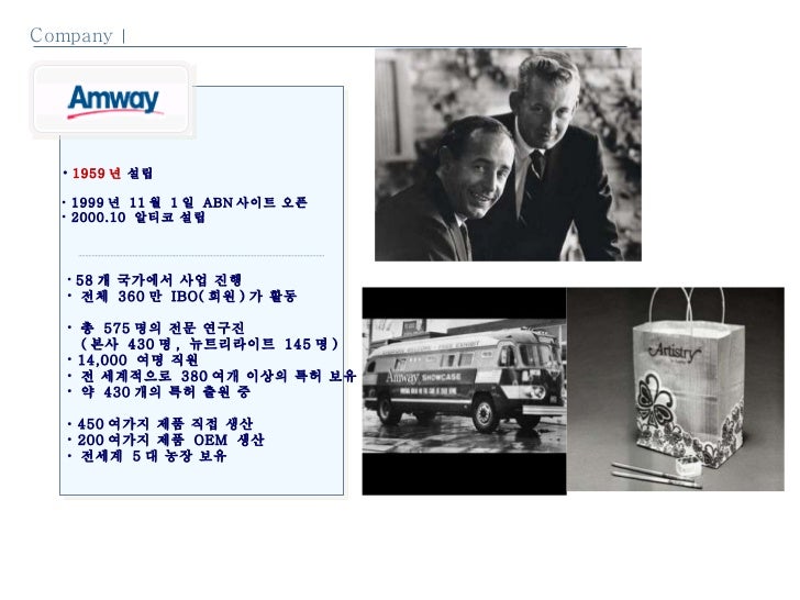4. 6. <ul><li>1959 년 설립 </li></ul><ul><li>1999 년 11 월 1 일 ABN 사이트 오픈 </li></ul><ul><li>2000.10 알티코 설립 </li></ul><ul><li>58 개 국가에서 사업 진행 </li></ul><ul><li>전체 360 만 IBO( 회원 ) 가 활동 </li></ul><ul><li>총 575 명의 전문 연구진 ( 본사 430 명 , 뉴트리라이트 145 명 ) </li></ul><ul><li>14,000 여명 직원 </li></ul><ul><li>전 세계적으로 380 여개 이상의 특허 보유 </li></ul><ul><li>약 430 개의 특허 출원 중 </li></ul><ul><li>450 여가지 제품 직접 생산 </li></ul><ul><li>200 여가지 제품 OEM 생산 </li></ul><ul><li>전세계 5 대 농장 보유 </li></ul>Company 암웨이 본사 전경