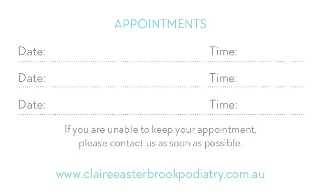 2. 2. www.claireeasterbrookpodiatry.com.au APPOINTMENTS Date: Time: Date: Time: Date: Time: If you are unable to keep your appointment, please contact us as soon as possible.