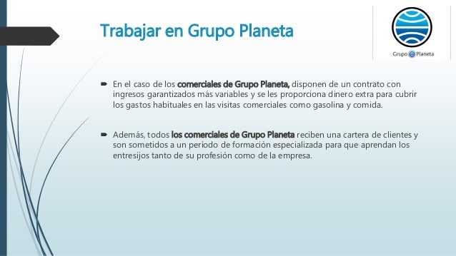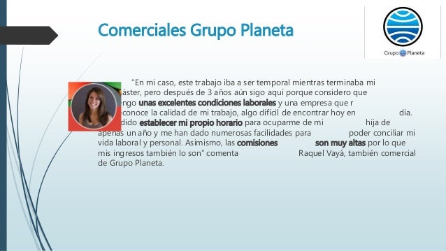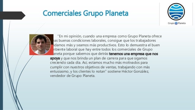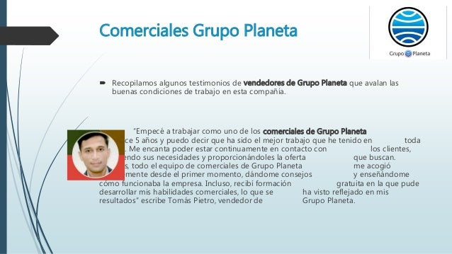 Presentación sobre los comerciales Grupo Planeta: en esta presentación podrás encontrar las ventajas de tranajar en esta empresa asi como testimonios de los propios comerciales o vendedores del grupo planeta. Trabajar en Grupo Planeta tiene inumerables ventajas que podrás saber a continuación.