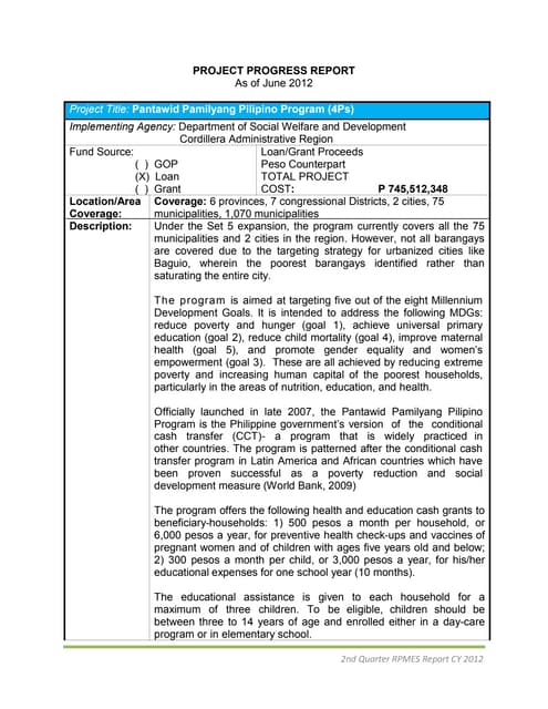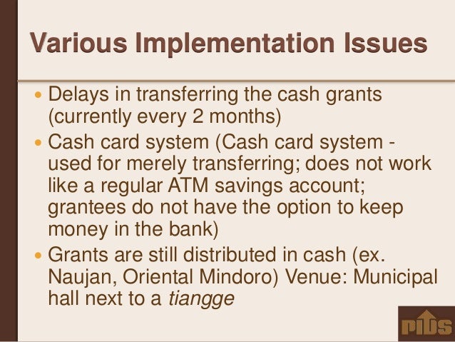 • DELAY IN TRANFERRING THE FUNDSFor an extremely poor family who heavily relies on the government transfer to meet the different needs of not only the children but the household in general, a delay in the transfer of funds will have adverse effects. They can opt to borrow from loan sharks which will diminish the value of the grants upon receiving due to interest burden just to meet their needs. They will not be able to budget this money properly since they need to pay off debt first. It would be very helpful if the program can set up a system that can provide the money in a more prompt way. CASH CARD SYSTEMThe program is said to disburse cash grants to beneficiaries through a cash card that acts like an ATM card. This cash card system however is simply used for transferring the grant and does not work like a regular ATM savings account. There is a certain period designated where the grantees are allowed to withdraw the money. Upon expiration of this period, the grantee can no longer access the funds. The downside of such system is that it does not give the option for beneficiaries to keep the money in the account. Had it been designed to act in such a manner, it can encourage grantees to keep the money there until the time comes when they need it. Because this option is not present, it is very easy on their part to spend the money right away.DISTRIBUTION OF GRANT IN CASHIn some areas, or at least in Naujan, Oriental Mindoro, the distribution of the 4Ps grants is made by handing over the cash to the beneficiaries in some predetermined date at the Municipal Hall. One disadvantage of this procedure is that once the grantees get a hold of the cash, they can spend it right away especially if the venue where the money is being distributed is right next to a flea market. It is very easy for business establishments to take advantage of this situation since the grantees are gathered in one area at the same time.