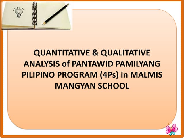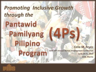 • Based on the paper that we did assessing the CCT in the Philippines, covering the design, implementation and impacts of the program.For this morning, I will focus my presentation on the role of the 4Ps in promoting inclusive growth. In particular I will show what it would take to make the program more effective in promoting inclusive growth.
