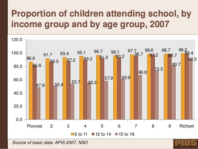 9. 9. Proportion of children attending school, by income group and by age group, 2007 86.6 91.7 93.4 95.1 96.7 96.1 97.7 98.6 98.7 99.2 80.6 86.0 87.2 89.2 91.9 93.2 95.7 97.2 98.7 98.4 47.9 50.4 53.7 55.3 57.9 60.9 66.8 73.5 80.7 90.5 0.0 20.0 40.0 60.0 80.0 100.0 120.0 Poorest 2 3 4 5 6 7 8 9 Richest 6 to 11 12 to 14 15 to 18 Source of basic data: APIS 2007, NSO