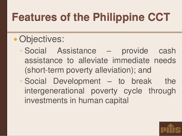 10. 10. Features of the Philippine CCT  Objectives: ◦ Social Assistance – provide cash assistance to alleviate immediate needs (short-term poverty alleviation); and ◦ Social Development – to break the intergenerational poverty cycle through investments in human capital