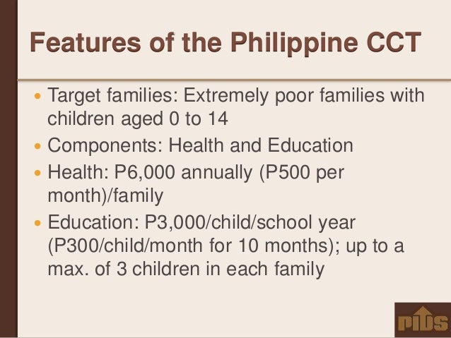 11. 11. Features of the Philippine CCT  Target families: Extremely poor families with children aged 0 to 14  Components: Health and Education  Health: P6,000 annually (P500 per month)/family  Education: P3,000/child/school year (P300/child/month for 10 months); up to a max. of 3 children in each family