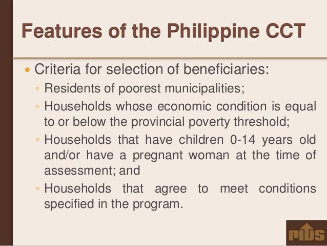 12. 12. Features of the Philippine CCT  Criteria for selection of beneficiaries: ◦ Residents of poorest municipalities; ◦ Households whose economic condition is equal to or below the provincial poverty threshold; ◦ Households that have children 0-14 years old and/or have a pregnant woman at the time of assessment; and ◦ Households that agree to meet conditions specified in the program.