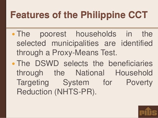 13. 13. Features of the Philippine CCT  The poorest households in the selected municipalities are identified through a Proxy-Means Test.  The DSWD selects the beneficiaries through the National Household Targeting System for Poverty Reduction (NHTS-PR).