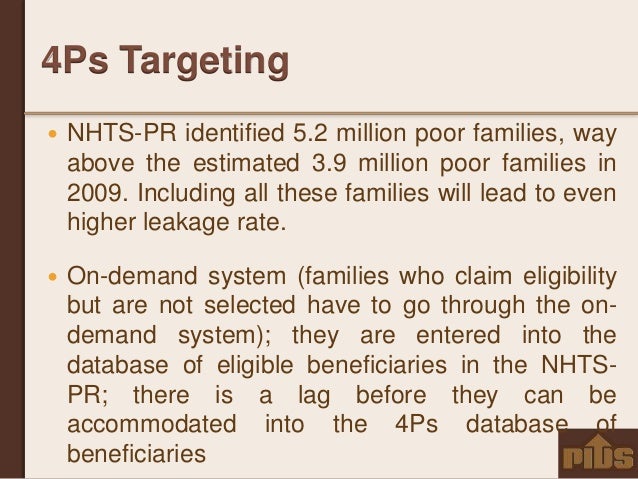 • ON-DEMAND SYSTEMFamilies who can prove their eligibility to the program can seek to be included among the beneficiaries. However, based on an interview with program implementers, these families are not directly entered into the database of 4Ps beneficiaries but on the database of eligible families under the NHTS-PR. This procedure may cause delay in the inclusion of deserving families to the program, if they get included at all.