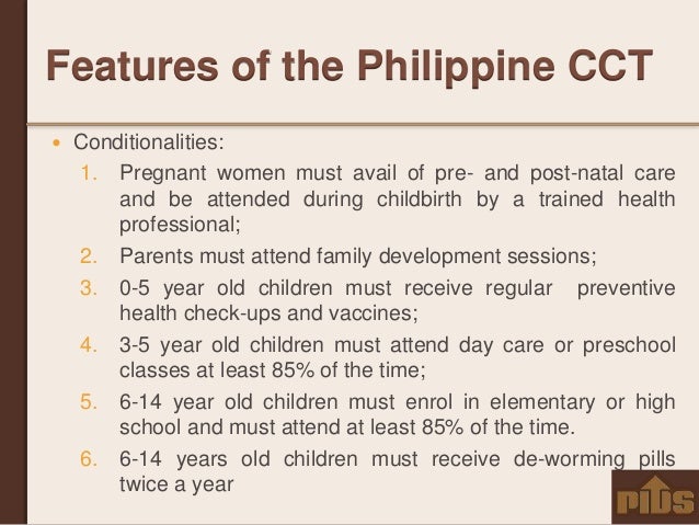 15. 15. Features of the Philippine CCT  Conditionalities: 1. Pregnant women must avail of pre- and post-natal care and be attended during childbirth by a trained health professional; 2. Parents must attend family development sessions; 3. 0-5 year old children must receive regular preventive health check-ups and vaccines; 4. 3-5 year old children must attend day care or preschool classes at least 85% of the time; 5. 6-14 year old children must enrol in elementary or high school and must attend at least 85% of the time. 6. 6-14 years old children must receive de-worming pills twice a year
