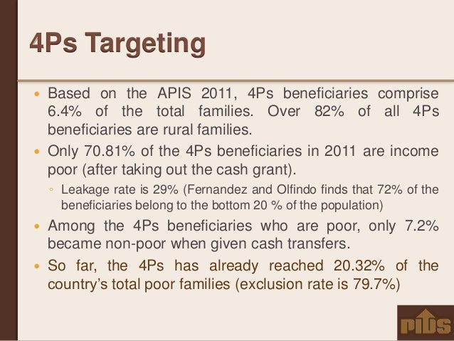 18. 18. 4Ps Targeting  Based on the APIS 2011, 4Ps beneficiaries comprise 6.4% of the total families. Over 82% of all 4Ps beneficiaries are rural families.  Only 70.81% of the 4Ps beneficiaries in 2011 are income poor (after taking out the cash grant). ◦ Leakage rate is 29% (Fernandez and Olfindo finds that 72% of the beneficiaries belong to the bottom 20 % of the population)  Among the 4Ps beneficiaries who are poor, only 7.2% became non-poor when given cash transfers.  So far, the 4Ps has already reached 20.32% of the country’s total poor families (exclusion rate is 79.7%)