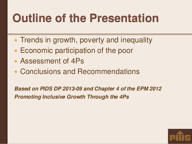 1. 1. Outline of the Presentation  Trends in growth, poverty and inequality  Economic participation of the poor  Assessment of 4Ps  Conclusions and Recommendations Based on PIDS DP 2013-09 and Chapter 4 of the EPM 2012 Promoting Inclusive Growth Through the 4Ps