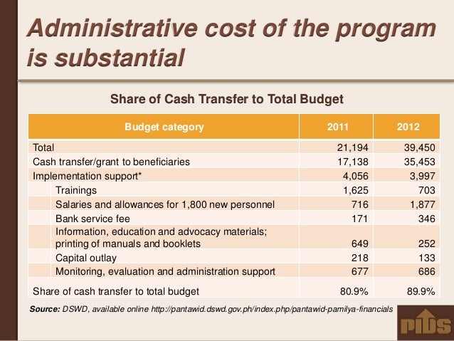 20. 20. Administrative cost of the program is substantial Budget category 2011 2012 Total 21,194 39,450 Cash transfer/grant to beneficiaries 17,138 35,453 Implementation support* 4,056 3,997 Trainings 1,625 703 Salaries and allowances for 1,800 new personnel 716 1,877 Bank service fee 171 346 Information, education and advocacy materials; printing of manuals and booklets 649 252 Capital outlay 218 133 Monitoring, evaluation and administration support 677 686 Share of cash transfer to total budget 80.9% 89.9% Source: DSWD, available online http://pantawid.dswd.gov.ph/index.php/pantawid-pamilya-financials Share of Cash Transfer to Total Budget