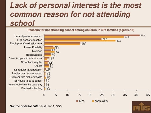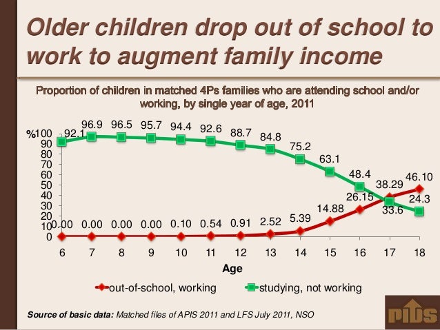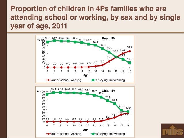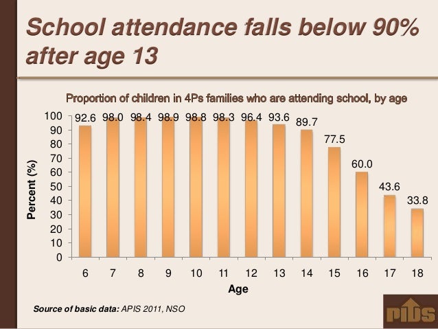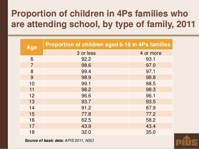 40. 40. Proportion of children in 4Ps families who are attending school, by type of family, 2011 Age Proportion of children aged 6-18 in 4Ps families 3 or less 4 or more 6 92.2 93.1 7 98.6 97.0 8 99.4 97.1 9 98.9 98.8 10 99.1 98.5 11 98.2 98.3 12 96.6 96.1 13 93.7 93.5 14 91.2 87.9 15 77.8 77.2 16 62.5 58.2 17 43.9 43.4 18 32.0 35.0 Source of basic data: APIS 2011, NSO