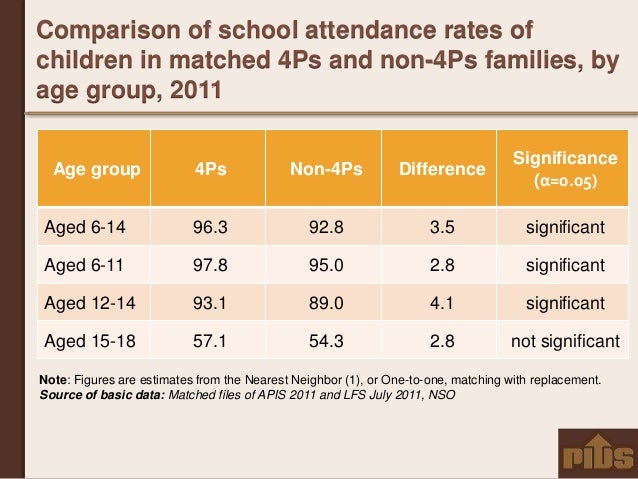 23. 23. Comparison of school attendance rates of children in matched 4Ps and non-4Ps families, by age group, 2011 Age group 4Ps Non-4Ps Difference Significance (α=0.05) Aged 6-14 96.3 92.8 3.5 significant Aged 6-11 97.8 95.0 2.8 significant Aged 12-14 93.1 89.0 4.1 significant Aged 15-18 57.1 54.3 2.8 not significant Note: Figures are estimates from the Nearest Neighbor (1), or One-to-one, matching with replacement. Source of basic data: Matched files of APIS 2011 and LFS July 2011, NSO