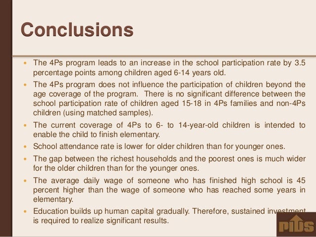 27. 27.  The 4Ps program leads to an increase in the school participation rate by 3.5 percentage points among children aged 6-14 years old.  The 4Ps program does not influence the participation of children beyond the age coverage of the program. There is no significant difference between the school participation rate of children aged 15-18 in 4Ps families and non-4Ps children (using matched samples).  The current coverage of 4Ps to 6- to 14-year-old children is intended to enable the child to finish elementary.  School attendance rate is lower for older children than for younger ones.  The gap between the richest households and the poorest ones is much wider for the older children than for the younger ones.  The average daily wage of someone who has finished high school is 45 percent higher than the wage of someone who has reached some years in elementary.  Education builds up human capital gradually. Therefore, sustained investment is required to realize significant results. Conclusions