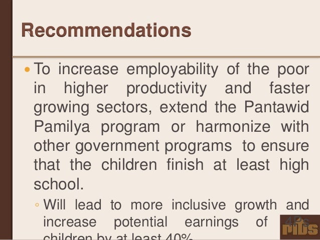 28. 28. Recommendations  To increase employability of the poor in higher productivity and faster growing sectors, extend the Pantawid Pamilya program or harmonize with other government programs to ensure that the children finish at least high school. ◦ Will lead to more inclusive growth and increase potential earnings of 4Ps