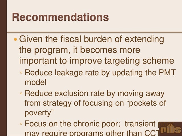 29. 29. Recommendations  Given the fiscal burden of extending the program, it becomes more important to improve targeting scheme ◦ Reduce leakage rate by updating the PMT model ◦ Reduce exclusion rate by moving away from strategy of focusing on “pockets of poverty” ◦ Focus on the chronic poor; transient poor