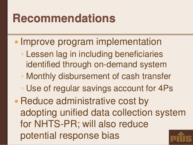30. 30. Recommendations  Improve program implementation ◦ Lessen lag in including beneficiaries identified through on-demand system ◦ Monthly disbursement of cash transfer ◦ Use of regular savings account for 4Ps  Reduce administrative cost by adopting unified data collection system for NHTS-PR; will also reduce potential response bias