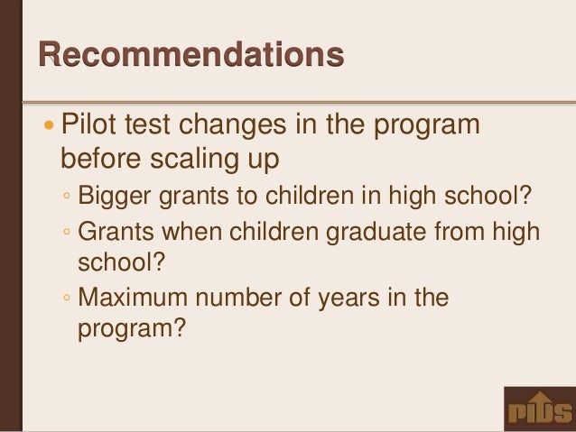 31. 31. Recommendations  Pilot test changes in the program before scaling up ◦ Bigger grants to children in high school? ◦ Grants when children graduate from high school? ◦ Maximum number of years in the program?
