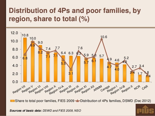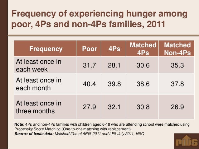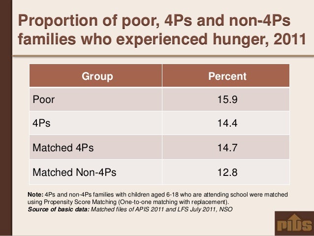 38. 38. Proportion of poor, 4Ps and non-4Ps families who experienced hunger, 2011 Group Percent Poor 15.9 4Ps 14.4 Matched 4Ps 14.7 Matched Non-4Ps 12.8 Note: 4Ps and non-4Ps families with children aged 6-18 who are attending school were matched using Propensity Score Matching (One-to-one matching with replacement). Source of basic data: Matched files of APIS 2011 and LFS July 2011, NSO