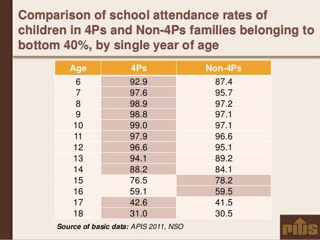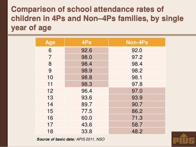 36. 36. Age 4Ps Non-4Ps 6 92.9 87.4 7 97.6 95.7 8 98.9 97.2 9 98.8 97.1 10 99.0 97.1 11 97.9 96.6 12 96.6 95.1 13 94.1 89.2 14 88.2 84.1 15 76.5 78.2 16 59.1 59.5 17 42.6 41.5 18 31.0 30.5 Comparison of school attendance rates of children in 4Ps and Non-4Ps families belonging to bottom 40%, by single year of age Source of basic data: APIS 2011, NSO