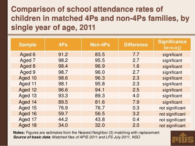 37. 37. Comparison of school attendance rates of children in matched 4Ps and non-4Ps families, by single year of age, 2011 Sample 4Ps Non-4Ps Difference Significance (α=0.05) Aged 6 91.2 83.5 7.7 significant Aged 7 98.2 95.5 2.7 significant Aged 8 98.4 96.9 1.6 significant Aged 9 98.7 96.0 2.7 significant Aged 10 98.6 96.3 2.3 significant Aged 11 98.1 95.8 2.3 significant Aged 12 96.6 94.1 2.5 significant Aged 13 93.3 89.3 4.0 significant Aged 14 89.5 81.6 7.9 significant Aged 15 76.9 76.7 0.3 not significant Aged 16 59.7 56.5 3.2 not significant Aged 17 44.2 43.8 0.4 not significant Aged 18 34.0 32.0 2.0 not significant Notes: Figures are estimates from the Nearest Neighbor (3) matching with replacement Source of basic data: Matched files of APIS 2011 and LFS July 2011, NSO